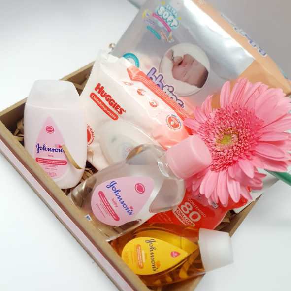 1 Pañales recién nacido, 1 Toallitas húmedas Huggies, 1 Shampoo Johnson’s 100ml, 1 Crema hidratante Johnson’s, 1 Aceite Baby 200ml, 1 Biberón Evenflo 120 ml
